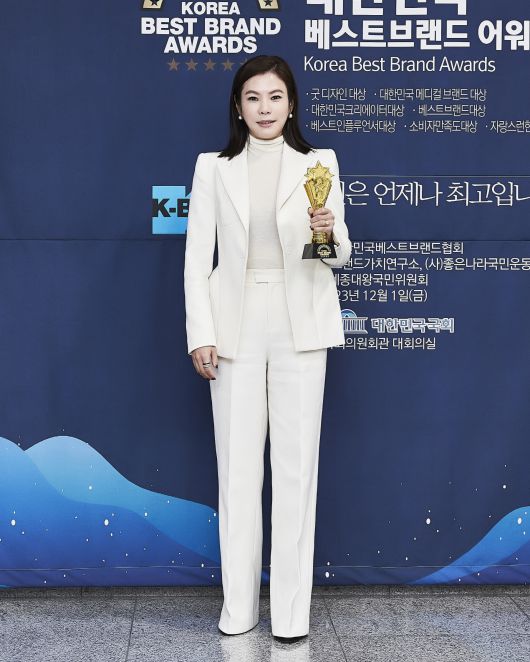 이에 수상을 한 음악감독 전수경이 기념촬영을 하고 있다.