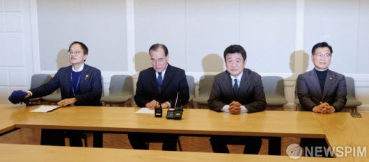 [서울=뉴스핌] 윤창빈 기자 = 박주민 더불어민주당 원내수석부대표(왼쪽부터), 이개호 더불어민주당 정책위의장, 유의동 국민의힘 정책위의장, 이양수 국민의힘 원내수석부대표가 6일 오후 서울 여의도 국회에서 열린 여야 '2+2 협의체' 회의에 자리하고 있다. 2023.12.06 pangbin@newspim.com