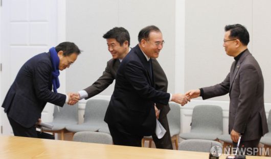 [서울=뉴스핌] 윤창빈 기자 = 박주민 더불어민주당 원내수석부대표(왼쪽부터), 유의동 국민의힘 정책위의장, 이개호 더불어민주당 정책위의장, 이양수 국민의힘 원내수석부대표가 6일 오후 서울 여의도 국회에서 열린 여야 '2+2 협의체' 회의에서 악수를 하고 있다. 2023.12.06 pangbin@newspim.com