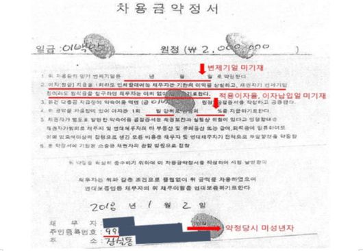 이자율이 법정 최고율보다 높거나 미성년자에게 대출하는 등 불공정한 대부계약에 따른 피해도 발생했다.