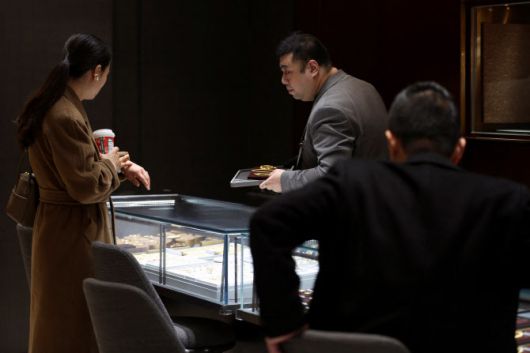 중국 상하이의 한 주얼리 매장에서 한 직원이 금 장신구를 들고 고객을 응대하고 있다.(사진=로이터) |
