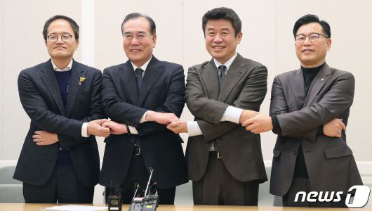 (서울=뉴스1) 임세영 기자 = 더불어민주당 박주민 원내수석부대표(왼쪽부터), 이개호 정책위의장, 국민의힘 유의동 정책위의장, 이양수 원내수석부대표가 6일 오후 서울 여의도 국회에서 열린 '2+2 협의체'에서 기념촬영을 하고 있다. 2023.12.6/뉴스1seiyu@news1.krCopyright ⓒ 뉴스1. All rights reserved. 무단 전재 및 재배포, AI학습 이용 금지.