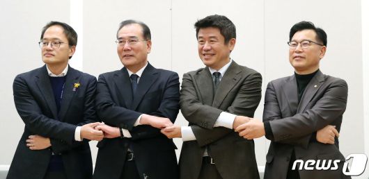 (서울=뉴스1) 임세영 기자 = 더불어민주당 박주민 원내수석부대표(왼쪽부터), 이개호 정책위의장, 국민의힘 유의동 정책위의장, 이양수 원내수석부대표가 6일 오후 서울 여의도 국회에서 열린 '2+2 협의체'에서 기념촬영을 하고 있다. 2023.12.6/뉴스seiyu@news1.krCopyright ⓒ 뉴스1. All rights reserved. 무단 전재 및 재배포, AI학습 이용 금지.