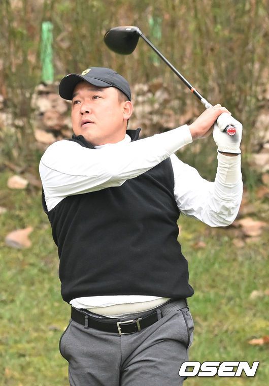 [OSEN=이천, 김성락 기자] 6일 오전 경기도 이천시 H1 클럽에서 제40회 KBO 야구인 골프대회가 열렸다. 4번홀 SSG 윤요섭 코치가 티샷을 하고 있다. 2023.12.06 / ksl0919@osen.co.kr