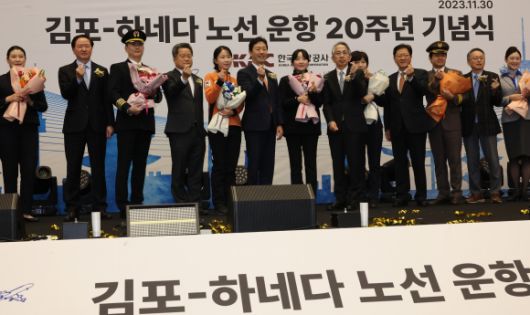 김포-하네다 노선 20주년 기념식 - 지난달 30일 서울 김포국제공항에서 열린 김포-하네다 노선 운항 20주년 기념식에서 윤형중 한국공항공사 사장, 아이보시 고이치 주한일본대사, 우기홍 대한항공 대표이사, 원유석 아시아나항공 대표이사 등이 공항 근로자에게 꽃다발을 전달하고 기념사진을 촬영하고 있다. 연합뉴스 |
