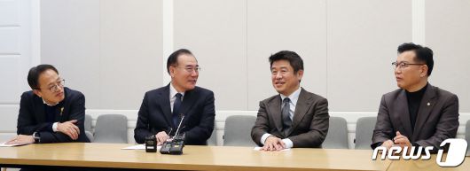 (서울=뉴스1) 임세영 기자 = 더불어민주당 박주민 원내수석부대표(왼쪽부터), 이개호 정책위의장, 국민의힘 유의동 정책위의장, 이양수 원내수석부대표가 6일 오후 서울 여의도 국회에서 열린 '2+2 협의체'에서 대화를 나누고 있다. 2023.12.6/뉴스1