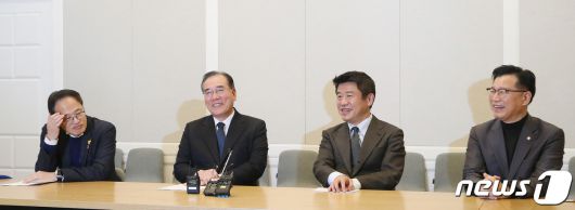 (서울=뉴스1) 임세영 기자 = 더불어민주당 박주민 원내수석부대표(왼쪽부터), 이개호 정책위의장, 국민의힘 유의동 정책위의장, 이양수 원내수석부대표가 6일 오후 서울 여의도 국회에서 열린 '2+2 협의체'에서 대화를 나누고 있다. 2023.12.6/뉴스1
