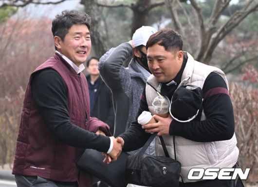 [OSEN=이천, 김성락 기자] 6일 오전 경기도 이천시 H1 클럽에서 제40회 KBO 야구인 골프대회가 열렸다. 키움 홍원기 감독, 삼성 박한이 코치가 인사를 나누고 있다. 2023.12.06 / ksl0919@osen.co.kr