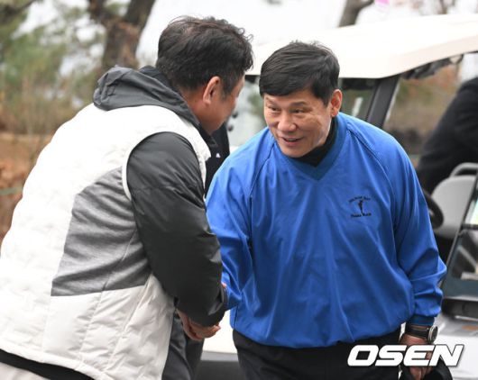 [OSEN=이천, 김성락 기자] 6일 오전 경기도 이천시 H1 클럽에서 제40회 KBO 야구인 골프대회가 열렸다. 차명석 단장, 허구연 KBO 총재가 인사를 나누고 있다. 2023.12.06 / ksl0919@osen.co.kr
