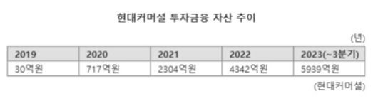 6일 금융권에 따르면 지난 9월 말 기준 현대커머셜의 영업자산별 비중은 산업금융이 51%, 기업금융와 투자금융이 각각 42%와 7%를 차지하고 있다. 특히 투자금융 시장에 처음 진출했던 지난 2019년 30억원 수준이었던 현대커머셜의 투자금융 자산은 9월 말 기준 5939억원을 기록했다. 2019년부터 현재까지 기준수익률(IRR)은 14.3%, 누적 투자수익은 1200억원을 돌파했다.