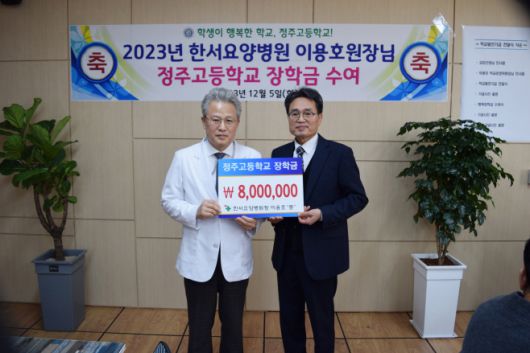 아시아투데이 신동준 기자 = 이용호 한서요양병원장(정주고등학교 학교운영위원회 위원장)이 5일 정주고등학교를 방문해 지역인재육성을 위한 장학금 800만 원을 기탁했다.