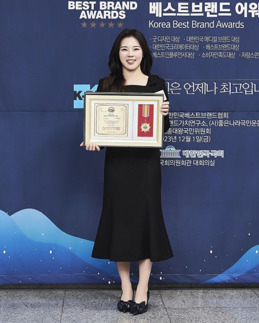 이에 수상을 한 주수진이 기념촬영을 하고 있다.