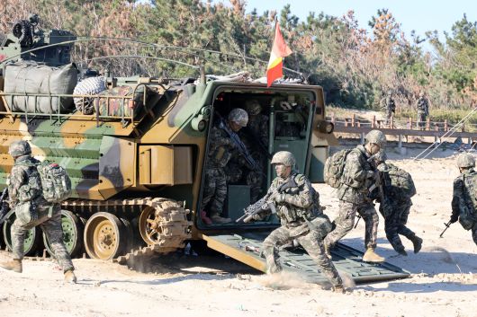 21일 경북 포항시 남구 해안에서 '2023 호국 합동상륙훈련'에 참가한 해병대원들이 한국형 상륙돌격장갑차(KAAV)에서 나와 돌진하고 있다. /연합뉴스 |