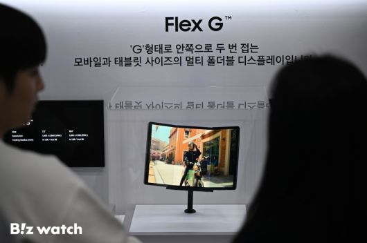 6일 오전 서울 강남구 코엑스에서 열린 2023 대한민국 산업기술 R&D 대전을 찾은 관람객들이 삼성디스플레이 부스에서 플렉스G 디스플레이를 관람하고 있다./사진=이명근 기자 qwe123@ |