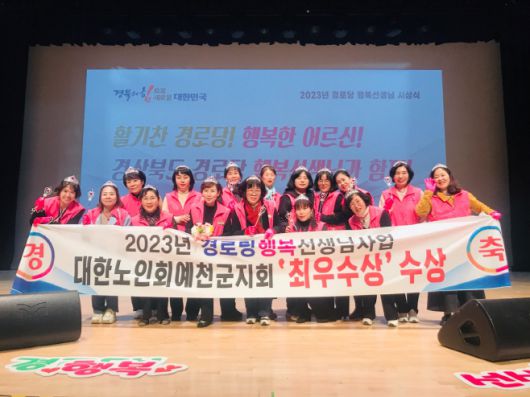 아시아투데이 장성훈 기자 = 경북 예천군 (사)대한노인회 예천군지회가 지난 4일 경북도청 동락관에서 개최된 '2023년 경로당 행복선생님 사업' 시상식에서 '경로당행복선생님 사업 최우수 기관상'과 '2023년 경로당행복선생님 지원 사업' 유공자로 김영남 행복선생님이 도지사 표창을 수상했다고 6일 밝혔다.