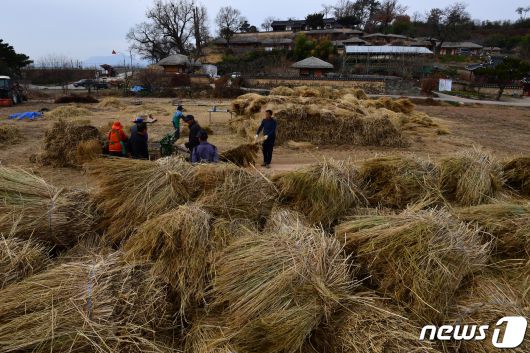 (경주=뉴스1) 최창호 기자 = 6일 오후 유네스코 세계문화유산 지정 마을인 경북 경주시 양동민속마을에서 주민들이 볏짚으로 초가집 이엉을 만들고 있다.2023.12.6/뉴스1
