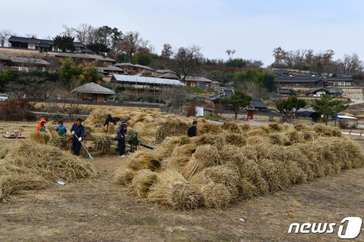 (경주=뉴스1) 최창호 기자 = 6일 오후 유네스코 세계문화유산 지정 마을인 경북 경주시 양동민속마을에서 주민들이 볏짚으로 초가집 이엉을 만들고 있다.2023.12.6/뉴스1