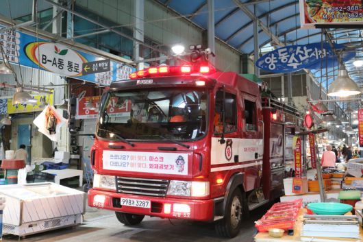 지난달 15일 광주 서구 양동시장에서 소방차 길 터주기 훈련이 이뤄지고 있다. 광주 서부소방서 제공 |