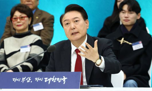 윤석열 대통령이 6일 부산항 국제전시컨벤션센터에서 열린 부산시민의 꿈과 도전 격려 간담회에서 마무리 발언을 하고 있다. 대통령실통신사진기자단 |