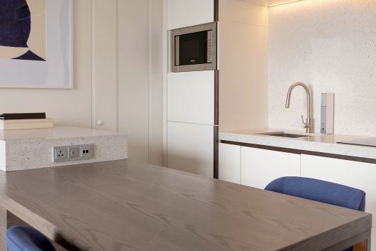 이번 호텔 객실에 설치된 노블 빌트인 정수기는 정수기 본체가 싱크대 하부에 설치되는 빌트인 타입이다. 미니멀한 디자인과 위생 케어, 스마트한 제품 관리가 특징이다.