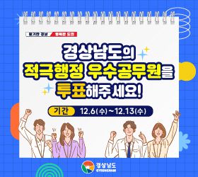 이번 도민투표는 지난 7월 1일부터 현재까지의 성과 기간에 한해 도민과 부서의 장으로부터 추천받은 도 소속 공무원의 성과 우수사례 8건에 대해 도민투표를 진행한다. 도민투표 방법은 경남도 누리집 '도민참여 플랫폼'에 접속하여 적극행정 팝업창을 통해 도민이 공감하는 최고의 적극행정 사례 3건에 투표하면 된다. 투표기간은 12월 6일부터 13일까지이며, 도민 누구나 참여할 수 있다. 참여자에게는 추첨을 통하여 소정의 상품권을 지급할 예정이다.