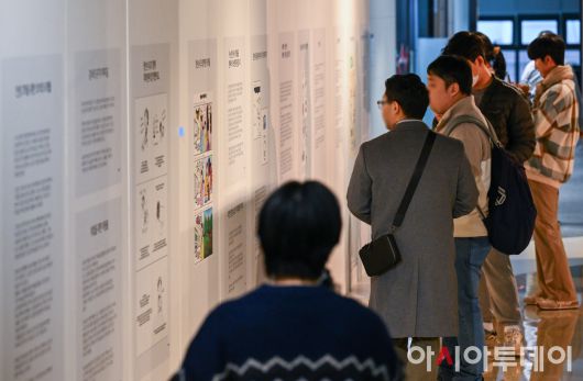 6일 서울 용산구 서울청년활동지원센터에서 열린 '2023 서울 청년수당 성과공유회-어제, 오늘 그리고 내일의 나'에서 참석자들이 청년수당 수기공모 당선작품을 둘러보고 있다. /정재훈 기자