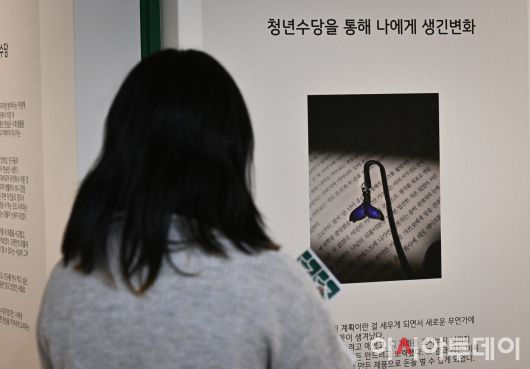 6일 서울 용산구 서울청년활동지원센터에서 열린 '2023 서울 청년수당 성과공유회-어제, 오늘 그리고 내일의 나'에서 참석자들이 청년수당 수기공모 당선작품을 둘러보고 있다. /정재훈 기자