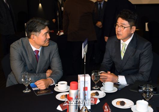 SSG 이숭용 신임 감독(왼쪽)이 30일 서울 강남구 엘리에나 호텔에서 진행된 2023 프로야구 스포츠서울 올해의 상 시상식에 앞서 키움 홍원기 감독과 이야기를 나누고 있다. 2023. 11. 30. 박진업기자 upandup@sportsseoul.com |