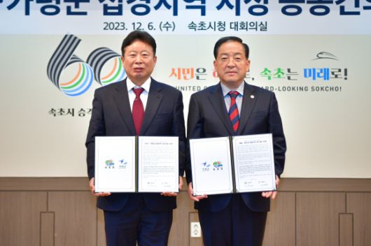이병선(사진 오른쪽) 강원 속초시장과 서태원 경기 가평군수가 6일 속초시청 대회의실에서 접경지역 지정 공동건의문에 서명을 한 뒤 기념 촬영을 하고 있다. 속초시 제공 |