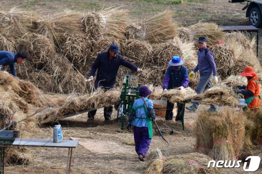 (경주=뉴스1) 최창호 기자 = 6일 오후 유네스코 세계문화유산 지정 마을인 경북 경주시 양동민속마을 민속체험장에서 주민들이 볏짚으로 초가집 이엉을 만들고 있다.2023.12.6/뉴스1