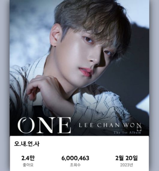이찬원의 정규 1집 'ONE'의 7번 트랙 '오. 내. 언. 사'가 지난 2일 기준 600만 스트리밍을 돌파했다.