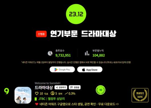 [정민규 기자] JTBC 드라마 '웰컴투 삼달리'가 12월 네티즌 어워즈 드라마대상 부문 공동 8위에 올라 있다. '웰컴투 삼달리'는 6일 오후 2시 26분 기준 10표를 얻어 0.3%의 득표율을 기록 중이다.