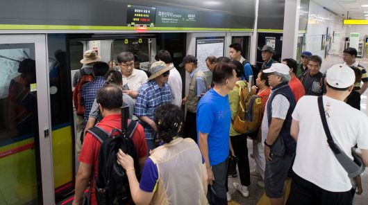 2017 년 9월 10일 서울 강북구 우이동 북한산우이역에서 우이신설선을 이용하는 어르신들 모습. /조선DB |
