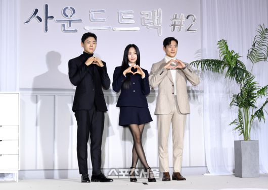 배우 손정혁(왼쪽)과 금새록(가운데), 노상현이 6일 서울 중구 앰버서더서울풀만호텔에서 진행된 디즈니+ '사운드트랙 #2' 제작발표회에서 취재진을 향해 포즈를 취하고 있다. '사운드트랙#2'는 피아노 과외 선생님 ‘현서’가 뜨겁게 사랑하고 차갑게 헤어졌던 전 연인과 바랜 꿈을 다시 잡아준 연하남과 함께 뮤직 프로젝트를 위해 한 집에 머물게 되면서 벌어지는 로맨스 드라마로 배우 금새록, 노상현, 손정혁 등이 출연하며 김희원 감독과 최정규 감독이 공동 연출을 맡았다. 2023. 12. 6. 박진업기자 upandup@sportsseoul.com