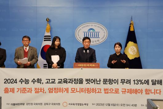 국회 교육위원회 소속 강득구 의원(더불어민주당)과 강민정 의원, 사교육걱정없는세상(사걱세)은 6일 오전 국회 소통관에서 '2024학년도 수능 수학영역 문항의 고교 교육과정 준수 여부 분석 결과 발표 기자회견'을 열고 "올해 수능 수학영역 46개 문항 중 6개 문항이 고교 교육과정 범위와 수준을 벗어나 출제된 것으로 판정됐다"고 밝혔다.