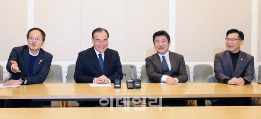 [이데일리 노진환 기자] 박주민(왼쪽부터) 더불어민주당 원내수석부대표, 이개호 정책위의장, 유의동 국민의힘 정책위의장, 이양수 원내수석부대표가 6일 오후 서울 여의도 국회에서 '2+2 협의체'를 갖고 있다.
