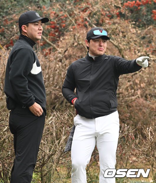 [OSEN=이천, 김성락 기자] 6일 오전 경기도 이천시 H1 클럽에서 제40회 KBO 야구인 골프대회가 열렸다. LG 김민성, 박동원이 이야기를 나누고 있다. 2023.12.06 / ksl0919@osen.co.kr