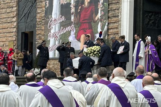 [서울=뉴시스] 김하은 인턴 기자 = 지난달 졸업을 며칠 앞두고 전 남자친구에 살해당한 이탈리아 여대생 줄리아 체체틴(22)의 장례식이 베네토주 파도바의 산타 주스티나 대성당에서 엄수됐다.