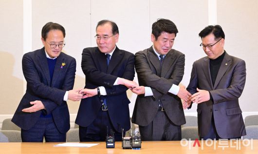아시아투데이 이병화 기자 = 박주민 더불어민주당 원내수석부대표(왼쪽부터), 이개호 정책위의장, 유의동 국민의힘 정책위의장, 이양수 원내수석부대표가 6일 국회에서 열린 '2+2 협의체'에서 손을 맞잡고 있다. ⓒ "젊은 파워, 모바일 넘버원 아시아투데이"