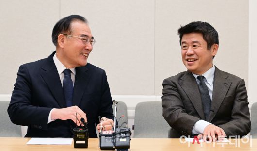 아시아투데이 이병화 기자 = 유의동 국민의힘 정책위의장과 이개호 더불어민주당 정책위의장이 6일 국회에서 열린 '2+2 협의체'에서 대화를 나누고 있다. ⓒ "젊은 파워, 모바일 넘버원 아시아투데이"