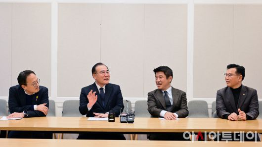 아시아투데이 이병화 기자 = 박주민 더불어민주당 원내수석부대표(왼쪽부터), 이개호 정책위의장, 유의동 국민의힘 정책위의장, 이양수 원내수석부대표가 6일 국회에서 열린 '2+2 협의체'에서 대화를 나누고 있다.