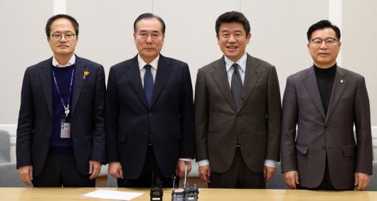 유의동 국민의힘 정책위의장과 이개호 더불어민주당 정책위의장이 6일 오후 서울 여의도 국회에서 열린 여야 2+2 합의체 회의에 참석해 기념촬영을 하고 있다. 왼쪽부터 더불어민주당 박주민 원내수석부대표, 이개호 정책위의장, 국민의힘 유의동 정책위의장, 이양수 원내수석부대표. |