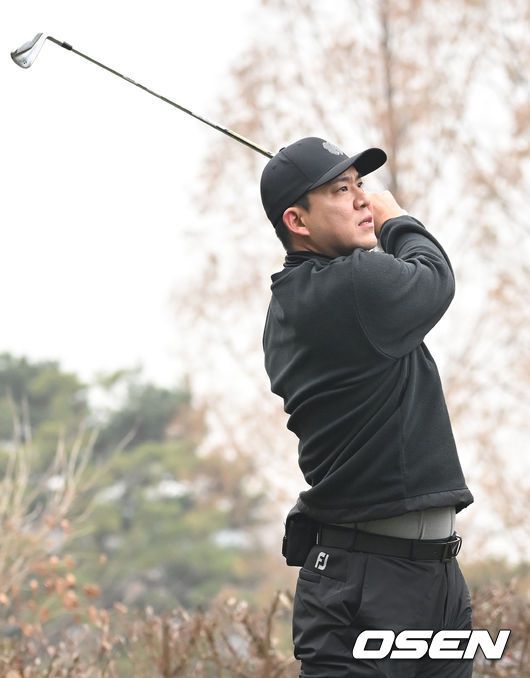 [OSEN=이천, 김성락 기자] 6일 오전 경기도 이천시 H1 클럽에서 제40회 KBO 야구인 골프대회가 열렸다. LG 김민성이 티샷을 하고 있다. 2023.12.06 / ksl0919@osen.co.kr