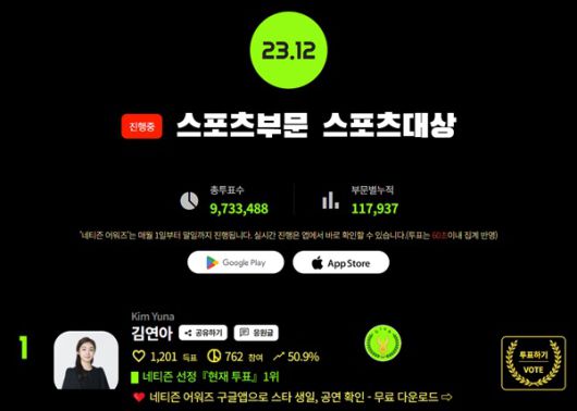 [정민규 기자] 김연아가 12월 네티즌 어워즈 스포츠대상 부문 선두를 질주 중이다. 김연아는 6일 오후 2시 45분 기준 1201표를 얻어 50.9%의 득표율을 보이고 있다.