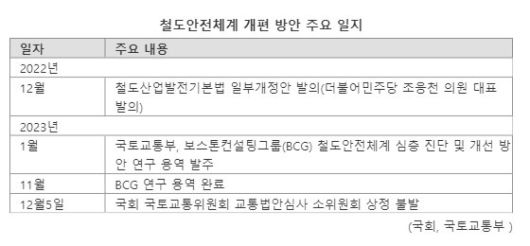 한편, 국토교통부는 '철도안전체계 심층진단 및 개선방안 연구' 용역 결과를 토대로 철도시설 유지·보수 체계를 포함한 철도 안전체계 개선 방안을 마련 중이다.