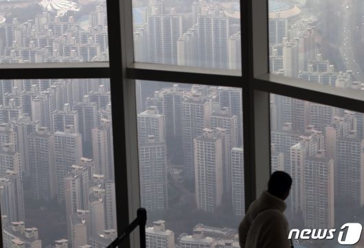 (서울=뉴스1) 박세연 기자 = 6일 서울 송파구 롯데월드타워 서울스카이를 찾은 시민이 아파트단지를 바라보고 있다. 부동산 시장이 침체하며 서울 강남 지역 단지에서 하락 거래가 이어지고 있다. 이날 국토교통부 실거래가 공개시스템에 따르면 서울 강남구 대치동 대치삼성 전용 59㎡는 지난달 16일 12억원에 중개 거래됐다. 같은 크기는 지난달 17억원에 거래됐는데 한 달도 안 돼 5억원이 하락한 셈이다. 2023.12.6/뉴스1
