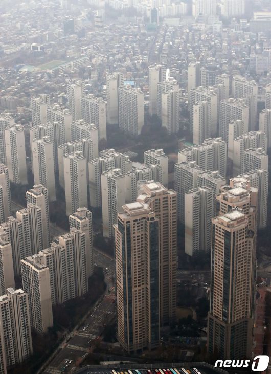 (서울=뉴스1) 박세연 기자 = 부동산 시장이 침체하며 서울 강남 지역 단지에서 하락 거래가 이어지고 있다. 6일 국토교통부 실거래가 공개시스템에 따르면 서울 강남구 대치동 대치삼성 전용 59㎡는 지난달 16일 12억원에 중개 거래됐다. 같은 크기는 지난달 17억원에 거래됐는데 한 달도 안 돼 5억원이 하락한 셈이다. 사진은 이날 송파구 롯데월드타워 서울스카이에서 바라본 서울 아파트단지 모습. 2023.12.6/뉴스1