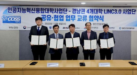 영진전문대?거제대학교?동원과학기술대학교?연암공과대학?창원문성대학교 등 5개 대학은 6일 경남권 4개 대학 LINC3.0 사업단·혁신지원사업단-인공지능 혁신융합대학사업단 간 공유·협업 업무교류 운영을 위한 협약을 체결했다고 밝혔다.
