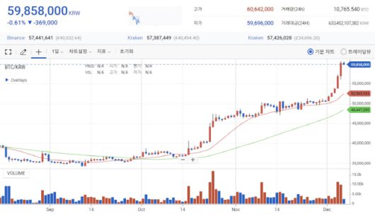 비트코인은 지난 9월 3500만원 선까지 하락하고 10월에 4000만원, 11월에 5000만원을 돌파해 이날 6000만원 선을 등락하고 있다.