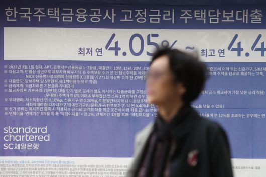 한 시민이 서울의 한 은행에 붙은 특례보금자리론 안내 현수막 앞을 지나고 있다. 연합뉴스 |